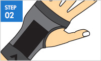 중앙 샌드위치형 니트부분이 비틀어지지 않도록 조정합니다. 처짐이 없도록 가볍게 당겨보십시오. 너무 세게 당기면 엄지 손가락 관절에 부담을 줄 수 있으므로 주의하시기 바랍니다.
